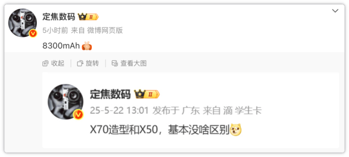 7月6日,爆料大神定焦数码甩出一条简单粗暴的帖子:“8300mAh!”配图还cue了句“X70造型跟X50没啥差别”。
