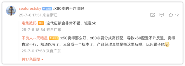 评论区高赞回复直言:“X50那么火,X60非要搞高低配,配置不升反降,销量肯定悬。这回荣耀学乖了,又成一个版本了!”